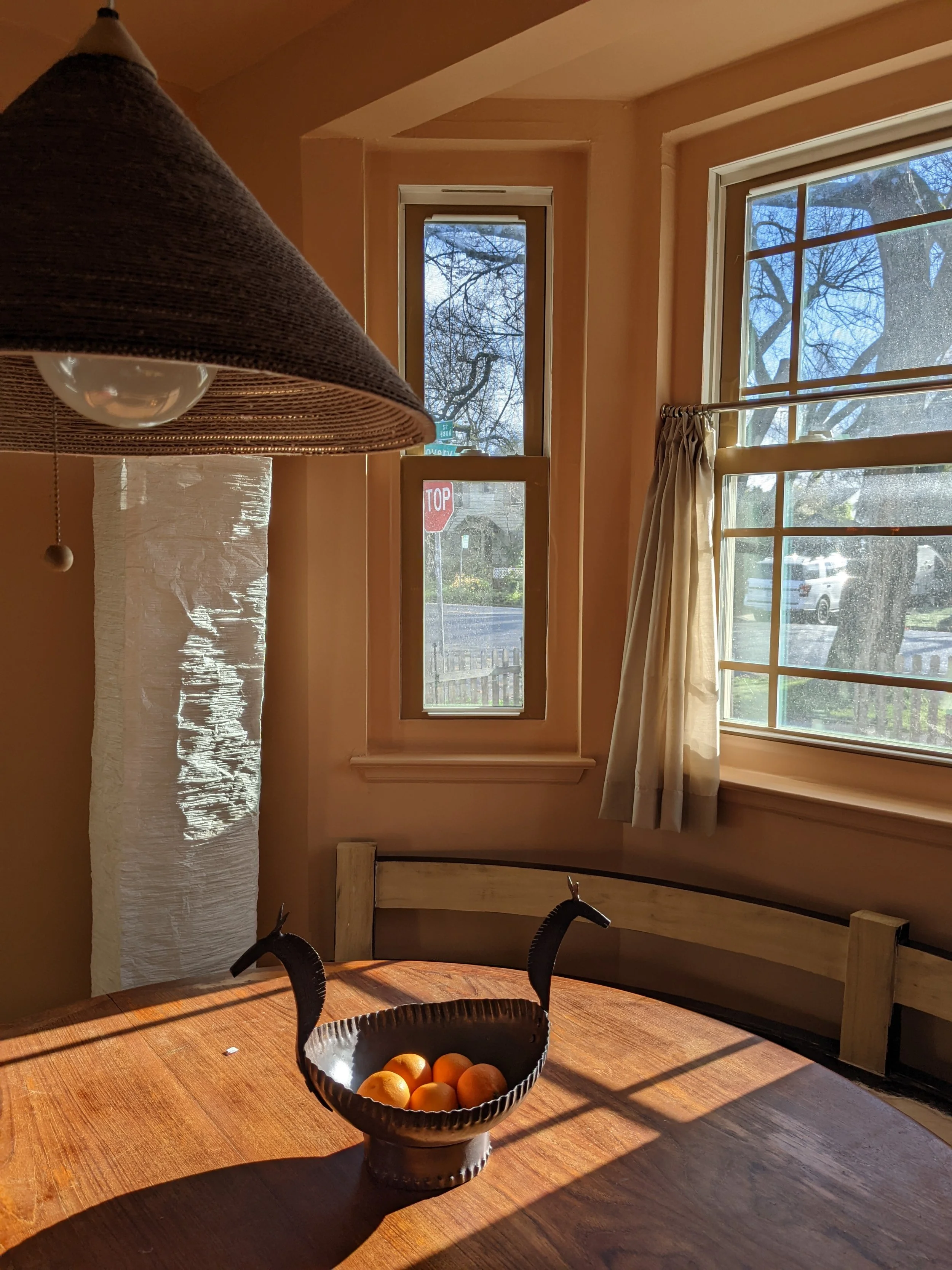 A vintage Greogry van Pelt pendant hangs in the breakfast nook.